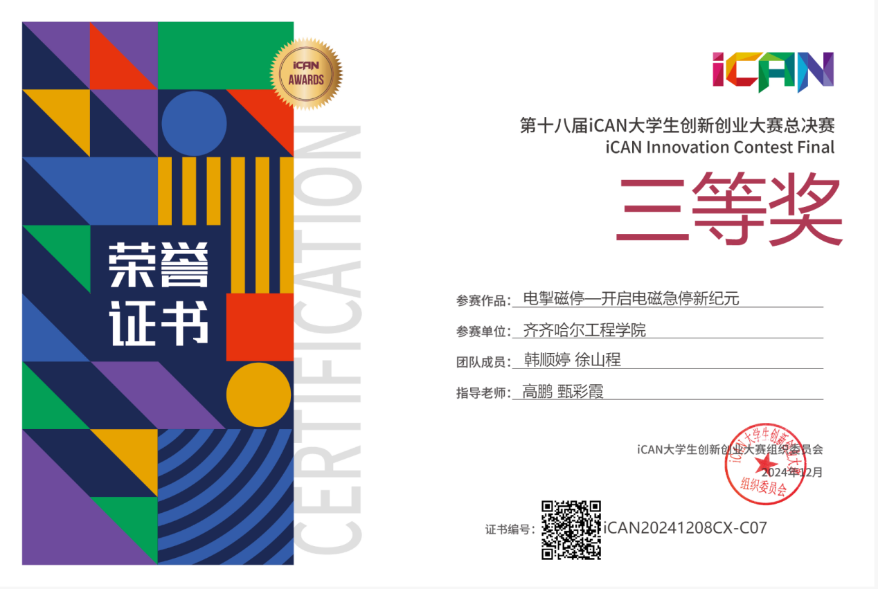 近日,iCAN大学生创新创业大赛组委会传来喜讯,伟德官网机电工程系电气工程及其自动化专业韩顺婷、徐山程团队的“电掣磁停—开启电磁急停新纪元”项目,荣获全国总决赛三等奖。 12月8日,第十八届iCAN大学生创新创业大赛全国总决赛在山东农业工程学院(淄博校区)成功落下帷幕。本届大赛设创新、创业与挑战赛三个赛道,共吸引了32144个团队参加,覆盖高校1500余所,分赛区选拔后,800个优秀项目参加全国决赛。伟德官网电气工程及其自动...