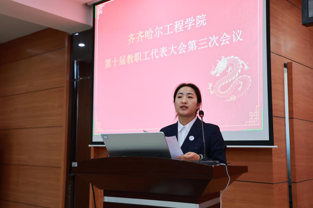 在大会预备会议上,副院长、党委委员、工会主席白雪作《伟德bv1946官网第十届教职工代表大会第三次会议筹备工作情况报告》,通报了出席会议的教职工代表情况,表决通过了监票人、计票人名单和大会议程。