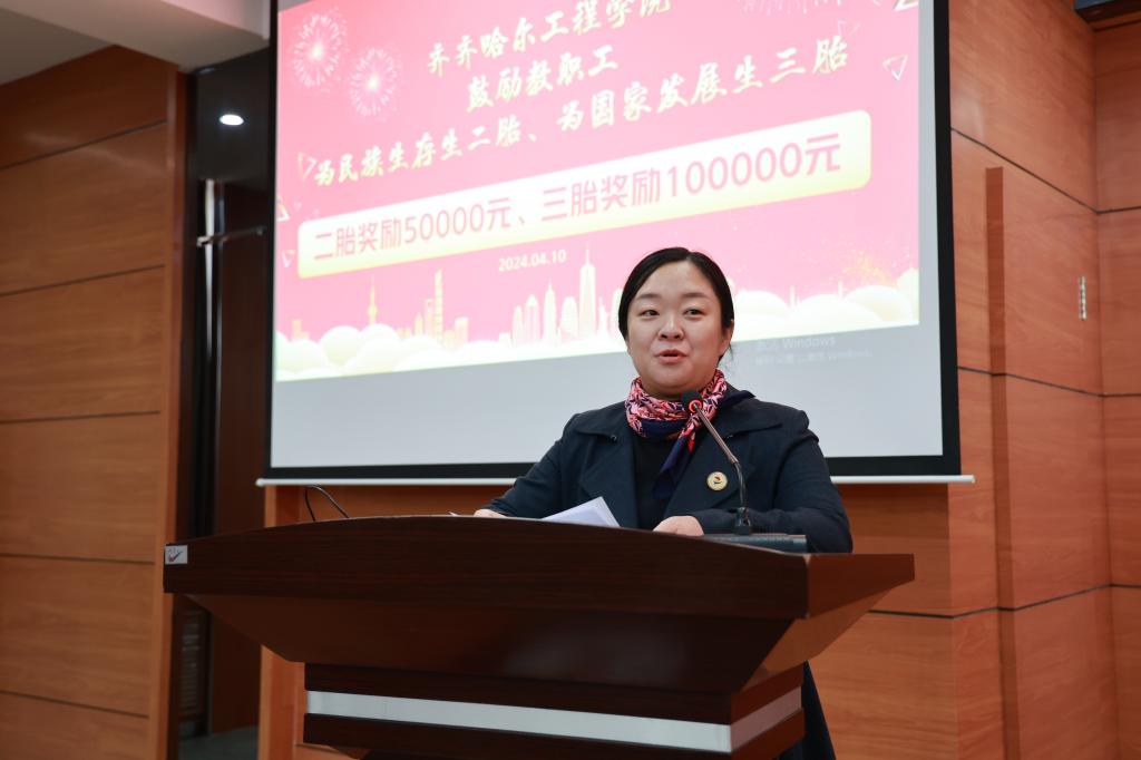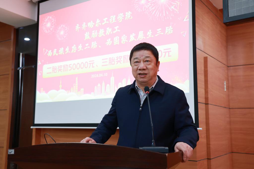 曹勇安在讲话中指出,人口是民族繁衍生息的前提,是国家发展壮大的基础。学校实施彰显“以人为本”理念的生育多胎奖励制度,给予生育二胎、三胎的教职工分别奖励5万元、10万元,是惠及教职工权益的一件大事。他强调,人口规模的优势,是维持中国竞争力的最关键因素。由学校出资,向响应国家政策的教职工发放生育奖励,实现生有所养、育有所依,是对教职工的关心和爱护。希望全校教职工积极响应国家号召,承担起民族生存和国家发展的社会责任。