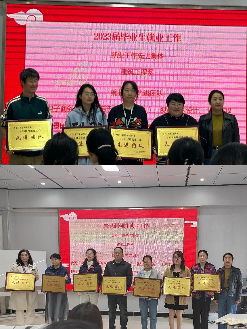 会议首先对在2023届毕业生就业工作中表现突出的工作集体和工作团队进行表彰。建筑工程系获得就业工作先进集体奖,电子商务、护理学专升本(二年制)、视觉传达设计、土木工程风景园林、工程管理、电气工程及其自动化、车辆工程、电子科学与技术、汽车服务工程、机械设计制造及其自动化专业获就业工作先进团队奖。