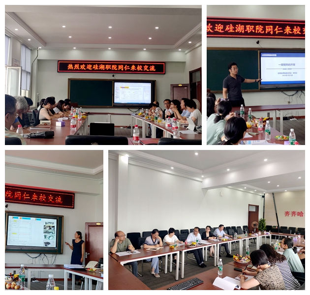 副院长张静、教务处副处长李文禹、机电工程系副主任敖林喆及相关教师分别介绍了学校管理整体思路、教学质量奖建立思路和机制、机电工程系整体情况等,并向硅湖职业技术学院的领导、教师展示了学校FT课程建设的整体逻辑以及一级矩阵、二级矩阵、三级矩阵、开课说明的逻辑思路。