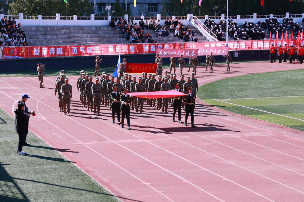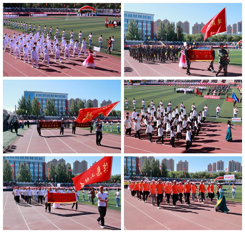 在雄壮激昂的乐曲声中,国旗、校旗、标语牌、红旗、花束、彩球方队,以及裁判员队伍、运动员队伍、各系方队共39支队伍,迈着整齐的步伐,喊着嘹亮的口号,精神抖擞、意气风发地从主席台前走过。