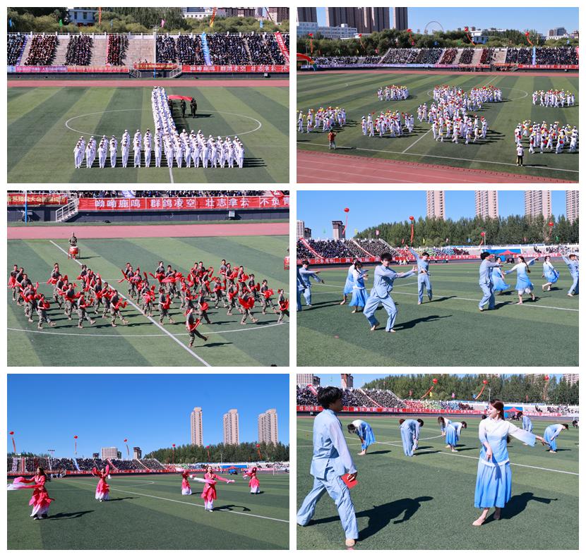 本次运动会还为学校师生们带来了精彩的文艺表演。大型团体操表演,阵容强大、气势恢宏、场面震撼。《觉醒年代》表演者以舞蹈剧的形式,向传承伟大建党精神、赓续红色精神血脉的中国共产党人致敬。教官团表演的节目是《扭秧歌》,队员们腰系大红绸,用欢快的舞蹈展现了民族自豪感和自信心,表达了祝福祖国“风调雨顺、国泰民安”的心愿。绿茵草地上青春洋溢,赢得现场观众的阵阵喝彩。