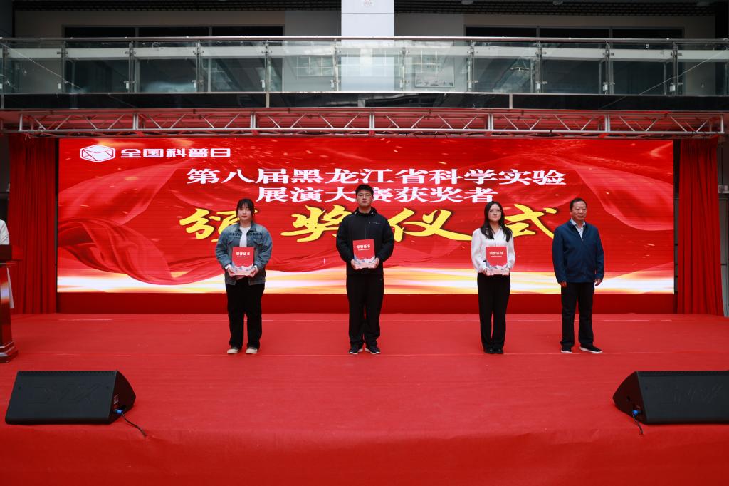 曹然彬向获得第八届黑龙江省科学实验展演大赛获奖者颁奖。
