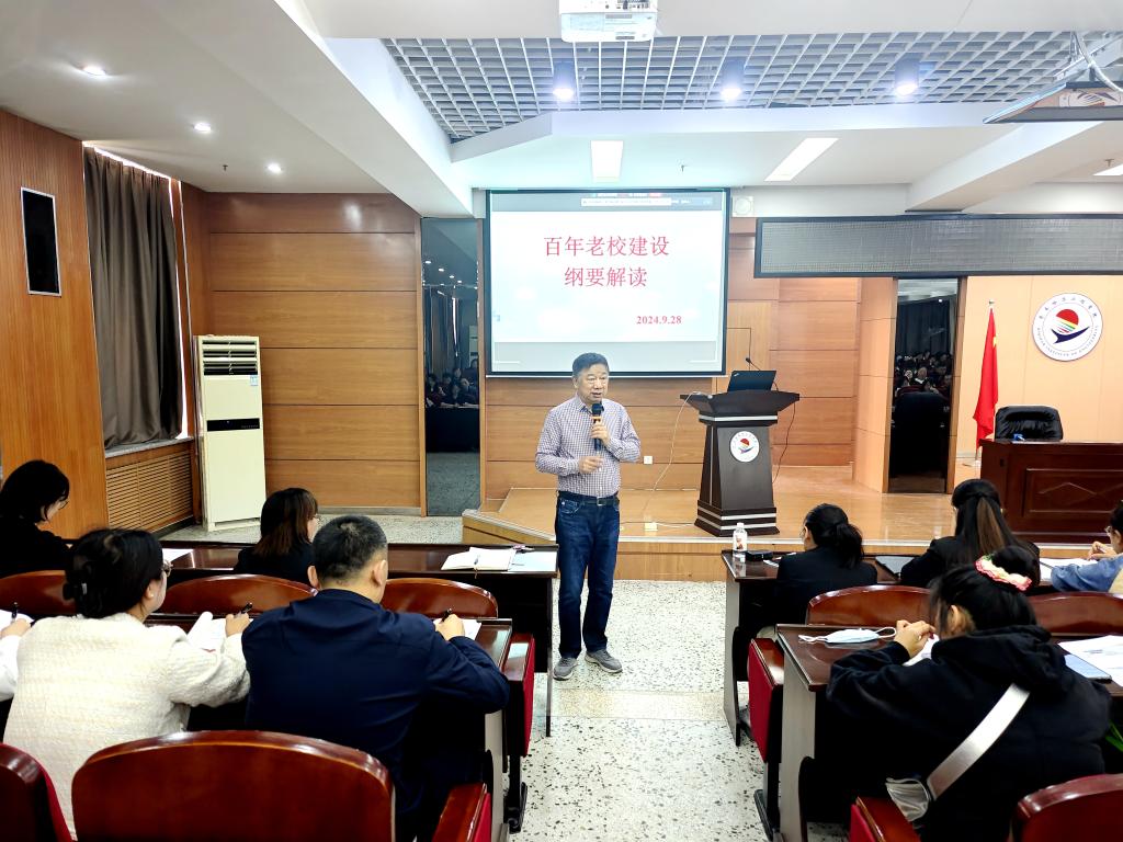 理事长曹勇安以“百年老校建设纲要解读”为题,从百年老校建设指导思想、百年老校建设精神引领、百年老校建设理论指导、百年老校建设实践方略、百年老校建设实施步骤五个方面出发,详细阐述建设百年老校要坚持实事求是的思想路线、秉承三大作风的组织路线;要大力弘扬教育家精神,爱生如子,待生挚亲;德润人心,文化天下;要围绕产业定专业,围绕专业办企业;提升学业成就感,提升百姓获得感;要通过FT课程教育研究,形成人才培养和服务社会有机融合的人才培养模式。