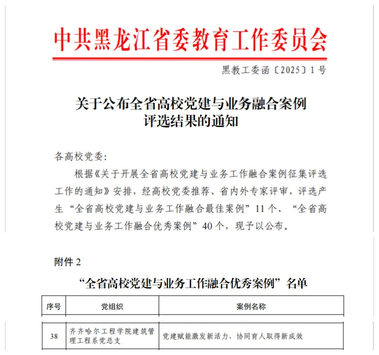 1月13日,黑龙江省委教育工委组织的全省高校党建与业务融合案例评选结果公布,伟德官网建筑管理工程系党总支的《党建赋能激发新活力,协同育人取得新成效》案例脱颖而出,获评优秀案例。