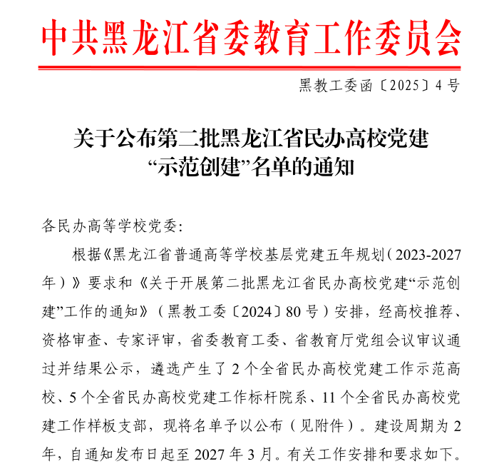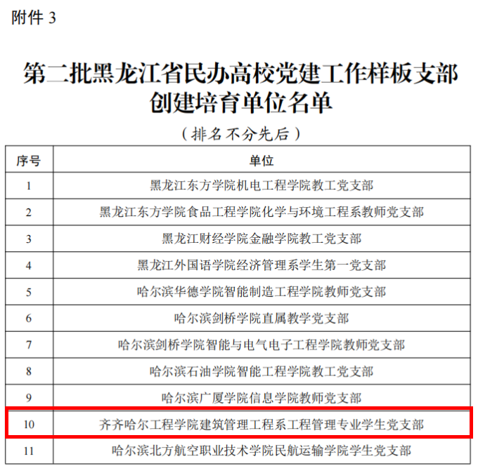 近日,黑龙江省委教育工委公布全省第二批民办高校党建“示范创建”评审结果,伟德官网建筑管理工程系工程管理专业学生党支部获批党建工作“样板支部”培育创建单位。