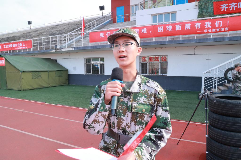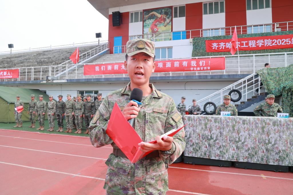 机电学院赵思博代表全体新生发言。他分享了对大学生活的憧憬与对军训的期待,希望全体新生以积极姿态迎接挑战,并用坚定的声音表达了克服困难、认真完成军训任务的决心。