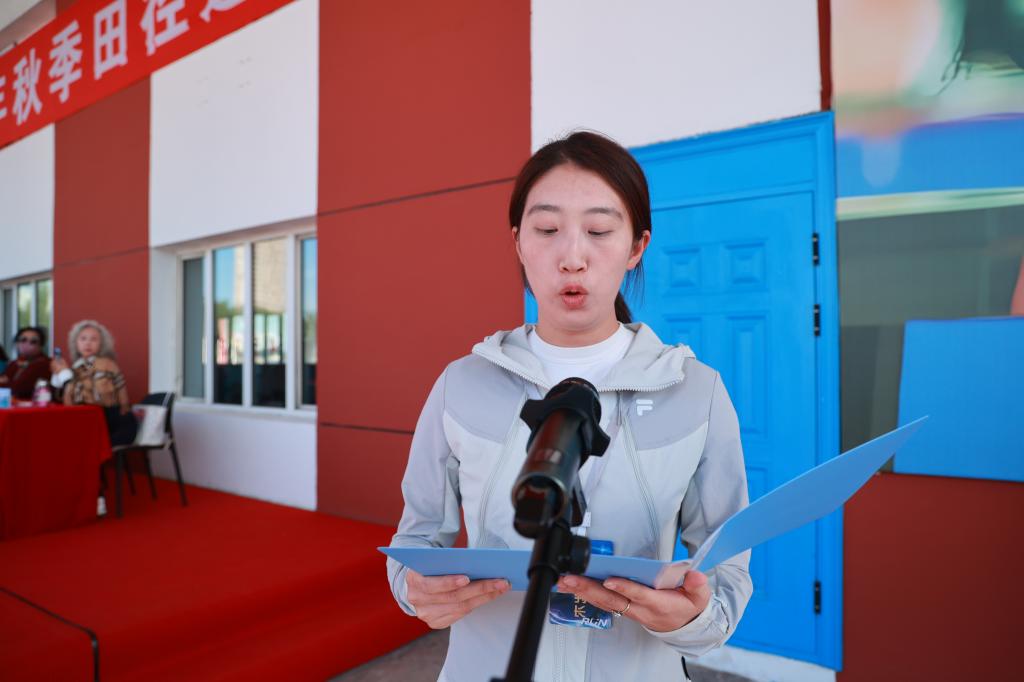 艺术与体育学院体育教研室主任杨阳代表裁判员庄严宣誓:严格遵守竞赛规则与裁判员纪律,认真履行裁判职责,做到公平执裁、公正评判,维护体育竞赛的公平信誉,为大会圆满成功贡献力量。