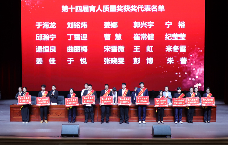 为大力弘扬教育家精神,进一步营造重视教育教学、崇尚先进的良好氛围,9月30日下午,学校在产教融合基地人民会堂举行第十四届教育质量奖颁奖大会,创校校长、理事长曹勇安,校长、党委副书记曹然彬,校党委书记郭伟东,党委副书记、纪委书记、副校长陈景鑫,副校长白雪、副校长张静、总会计师姜岩出席会议。会议由全面质量管理办公室主任孟艳辉主持,全体教职工参加。