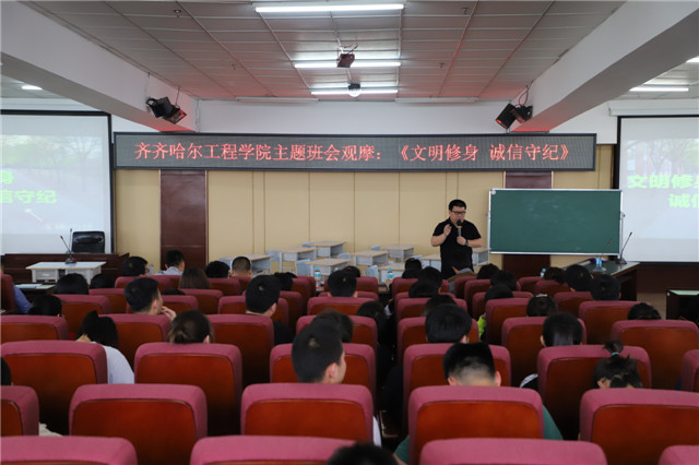 5月29日下午,学院2019文明修身主题班会观摩活动在图书馆501报告厅举行, 学院副院长张振笋、学生工作处处长贾宝栋、交通工程系主任张莹、团委书记周伟、各系学生工作副主任、全体辅导员和班主任老师与各班学生干部代表300人参加活动。