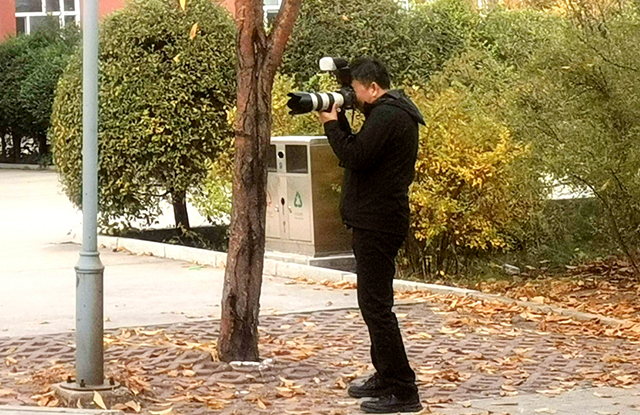 许老师对前来的摄影老师给予点赞,宋燕军在拍摄的时候始终背着一个重20多斤的双肩包儿,却乐此不疲奔走拍摄;黄洋为了拍好鸽子在地面吃食儿的镜头,自己躲在易湖边儿台阶下,把单反相机放在地上拍,既认真又有办法!