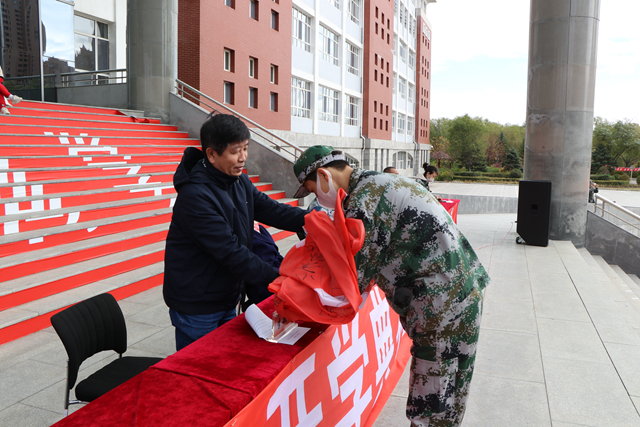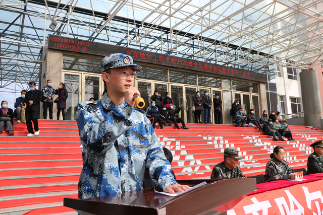 2020级新生代表、计科专业郭魁远同学在发言中,感慨来校报到时学长学姐们的热情相迎、北国校园渐浓秋色、见到辅导员老师和同学们的融洽氛围。表示要在接下来的新生军训中, 做到尊重教官、服从命令、刻苦训练,积极参加军训期间学校为新生组织的入学导航教育系列活动,在今后的学习和生活中做到,严格遵守学校各项规章制度,勤奋学习,积极参加社团活动,努力把自己培养成为“志存高远、人格健全、基础扎实、特长明显的应用性、职业型的创业者”。