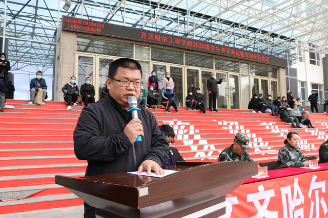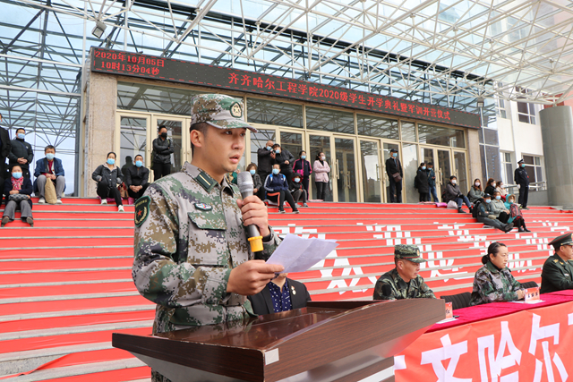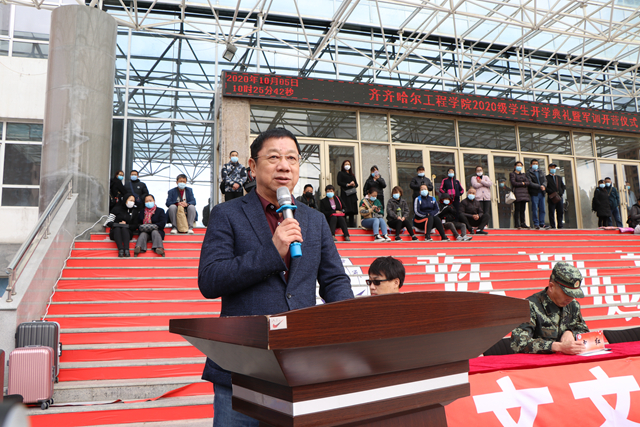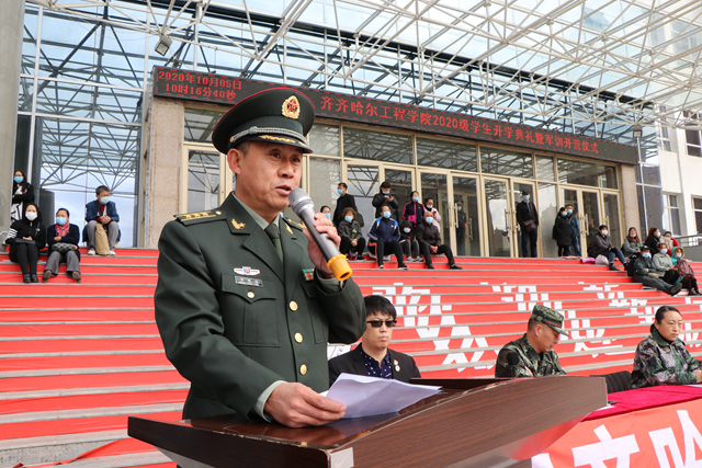 学校创校校长、理事长曹勇安,党委书记李敏义,副院长蒋春艳,工会主席、总会计师姜岩,副院长张振笋,与齐齐哈尔市龙沙区武装部政委尚晓伟,齐齐哈尔市空军93320部队管理参谋李强,学校团委负责人、军训团政委郭明敬,建筑工程系、健康与护理系学生工作副主任王丽萍,信息工程系学生工作副主任孙晓芳,机电工程系学生工作副主任王虹,学生社区服务中心负责人、军训团参谋长卞红,与来自全国17个省份的1820余名2020级学生及部分家长共同参加仪式。