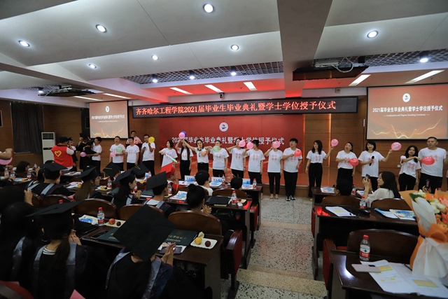 又一年,丁香花开;又一年,桃李芬芳。7月3日上午,学校2021届毕业生毕业典礼暨学位授予仪式在图书馆601报告厅隆重举行,共同庆祝1258名本科学生、196名专科学生顺利毕业。学校领导、学位评定委员会全体成员、各系(部)领导、教师代表、校友代表、毕业班辅导员及2021届毕业生和家长代表参加了典礼。本次典礼采用线下和线上抖音直播相结合的方式举行,近万名家长、校友、师生在线参会。伴随着学生们带来的歌曲闪唱《春暖花开》,毕业典礼拉开了序幕。