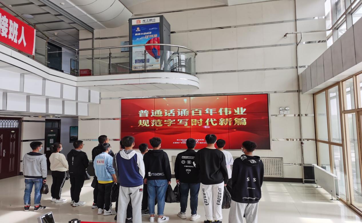 宣传部利用新媒体,加强宣传,营造良好氛围。以图书馆二楼大厅为阵地,在图书馆二楼大厅滚动播放语言文字宣传片,利用一周时间,学生分批观看,扩大传播影响,营造推广普通的浓厚氛围。