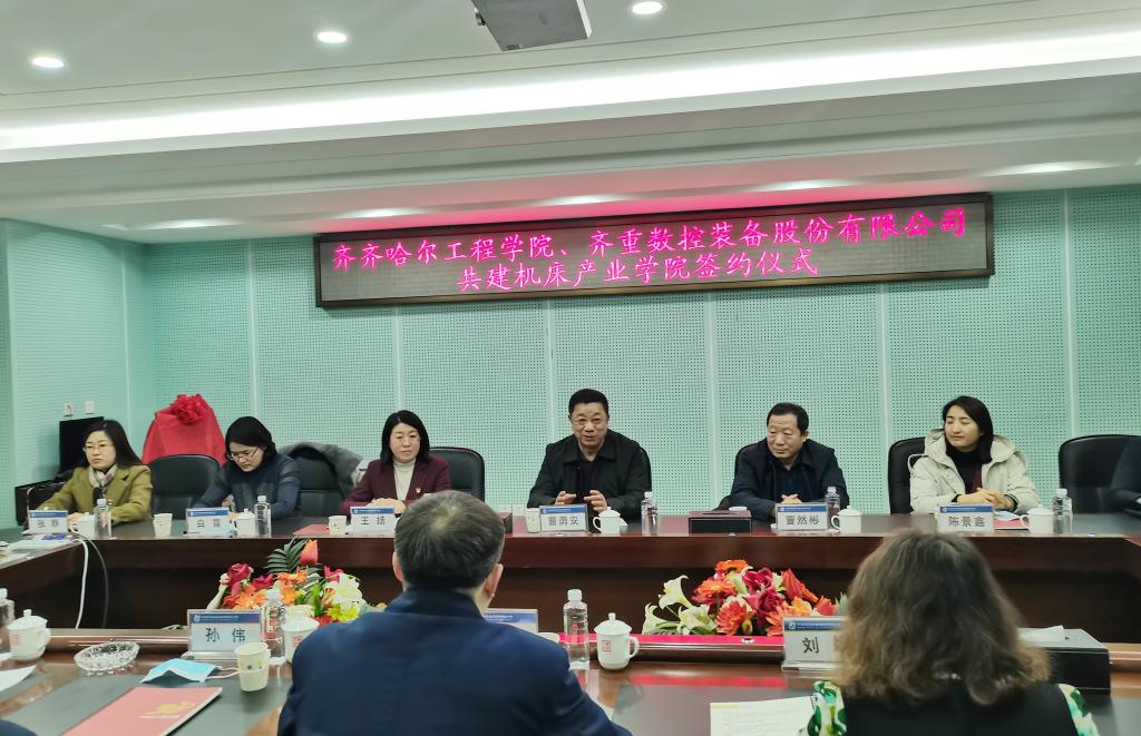 院长曹然彬与齐重数控装备股份有限公司总经理孙伟代表校企双方签署《机床产业学院校企共建框架协议书》,并为齐齐哈尔机床产业学院揭牌,标志着全国机床制造业首家机床产业学院正式成立!