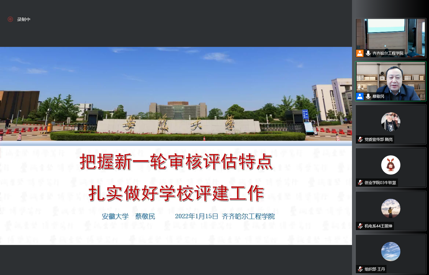 蔡敬民书记从新一轮审核评估六个突出特点、新一轮审核评估试点工作介绍、新一轮审核评估的申请与自评、新一轮审核评估的入校与整改四个方面开展讲座。