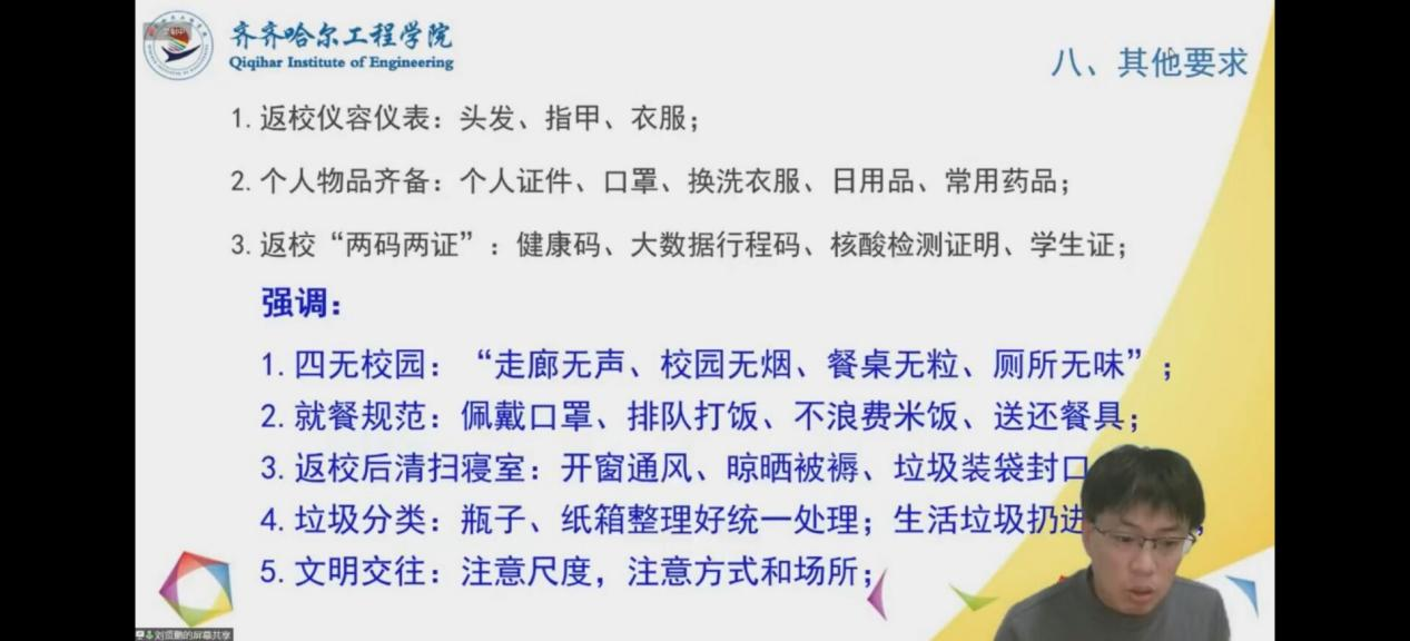 管理工程系学生工作副主任刘贤鹏传达春季学期开学疫情防控要求,从学生返校条件,返校要求,返校前的准备,返校时间,入校程序,到校后的健康管理进行了详细解读。