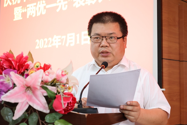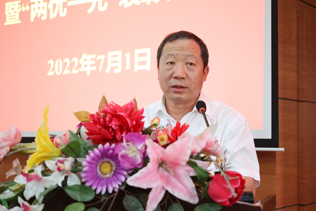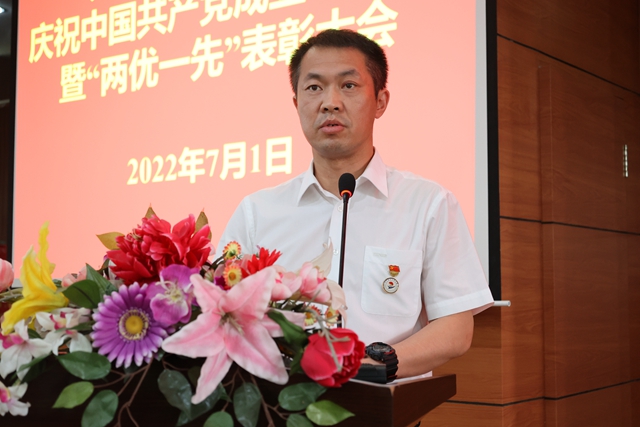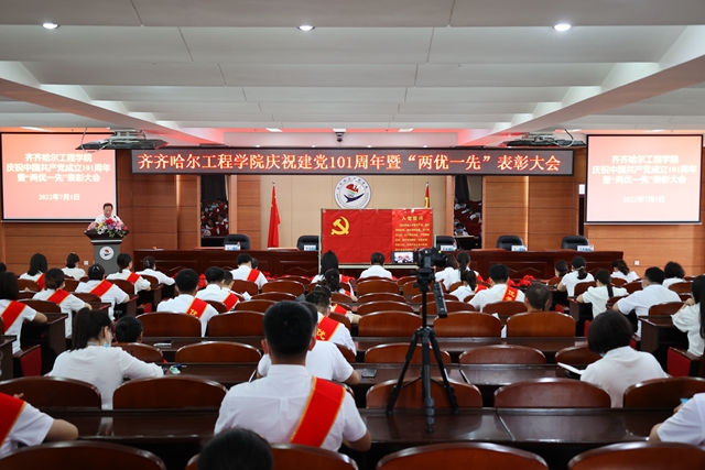 为庆祝中国共产党成立101周年,迎接党的二十大胜利召开,7月1日下午,学校在图书馆601报告厅召开庆祝建党101周年暨“两优一先”表彰大会,一批在学校各项事业建设中涌现出的先进基层党组织、优秀党务工作者和优秀共产党员受到表彰奖励。学校党委书记郭伟东出席会议并讲话,会议由院长、党委副书记曹然彬主持,校领导、党委委员、各党总支(直属党支部)、基层党支部的书记和委员,师生党员代表,受表彰的先进集体代表和优秀个人现场参会,其他党员线上参会。