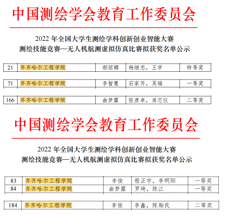 该专业学生参赛无人机航测虚拟仿真、虚拟仿真数字测图两个项目6组,共计12人参与本次赛事。最终获得无人机航测虚拟仿真比赛特等奖1组、一等奖1组、二等奖1组;虚拟仿真数字测图比赛一等奖2组,二等奖1组。所有参赛同学全部获奖,这是该专业继2021年全国大学生测绘学科创新创业智能大赛后又一次创造好成绩。