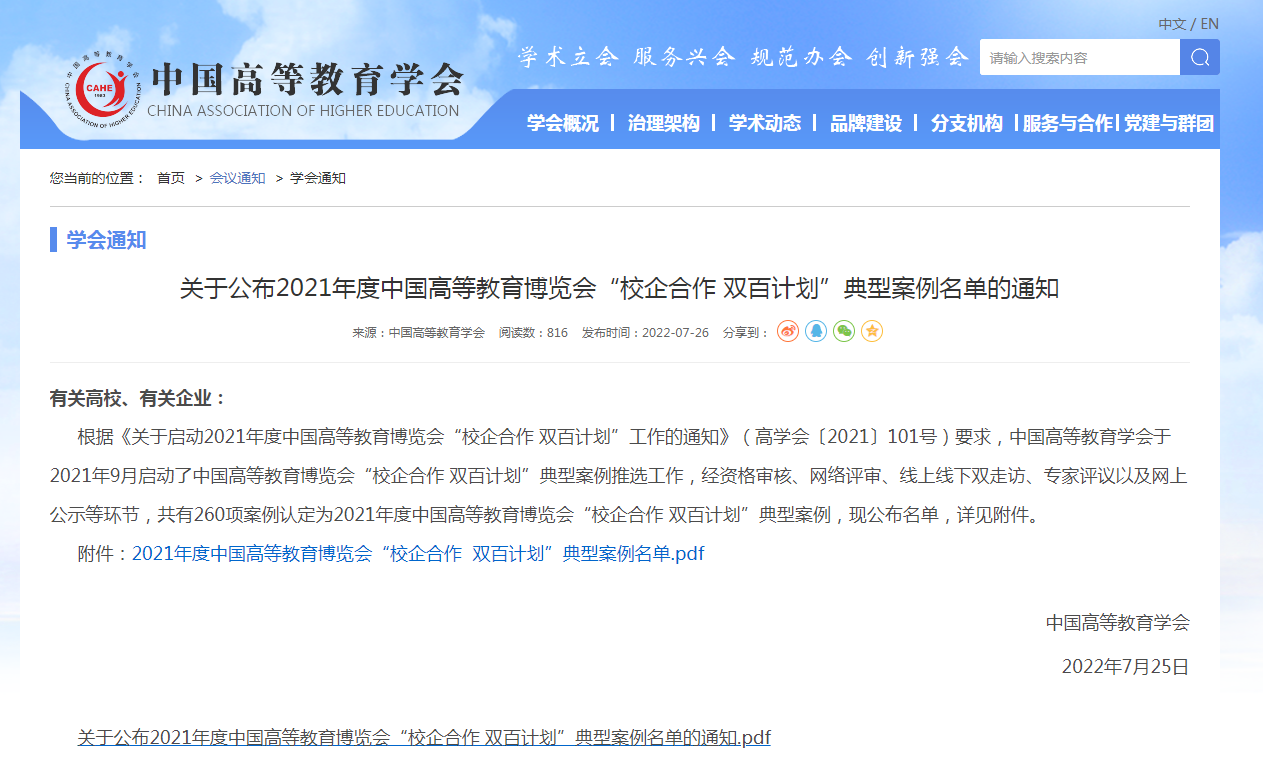 中国高等教育学会于2021年9月启动2021年度中国高等教育博览会,开展“校企合作 双百计划”典型案例推选工作。
