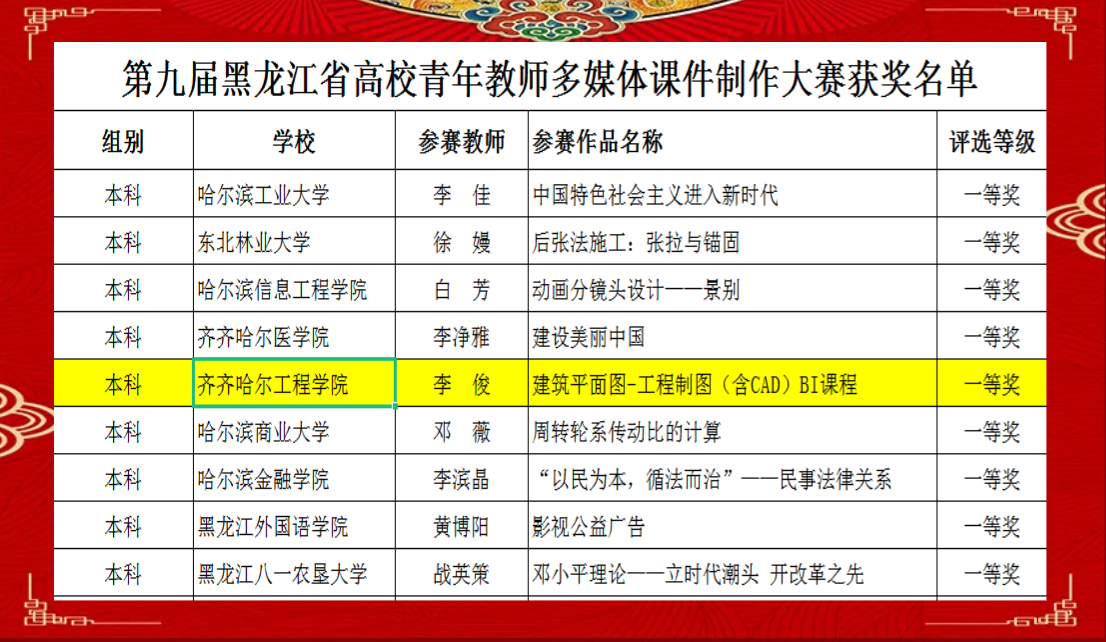 近日,伟德官网建筑工程系教师李俊在第九届黑龙江省高校青年教师多媒体课件制作大赛中荣获本科组一等奖。