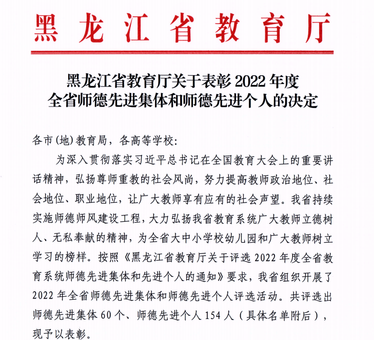 近日,2022年黑龙江省教育系统师德先进集体和先进个人评选结果公布。伟德官网院长助理陈景鑫同志获评全省教育系统“师德先进个人”荣誉称号。