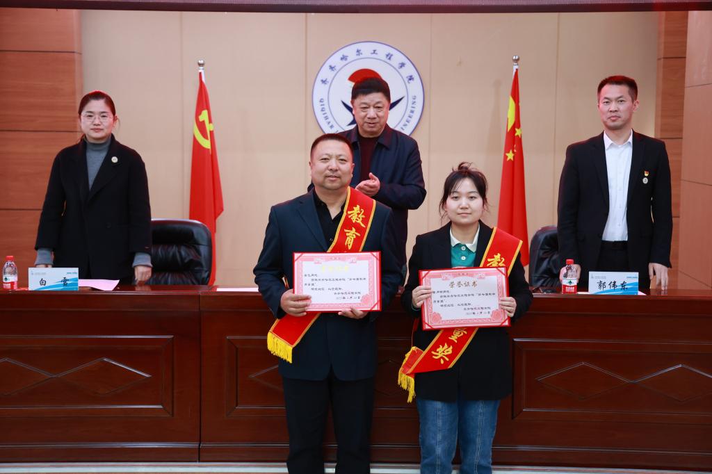 校领导为总务处开设的《春节传统美食》课程任课教师李月明、《居家生活技能常识》课程任课教师高飞颁奖。