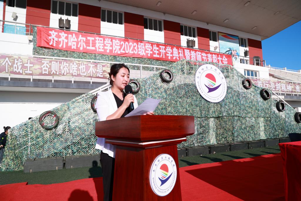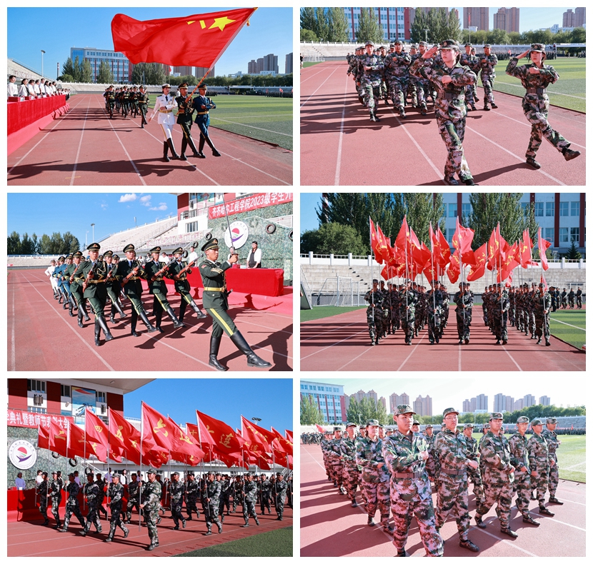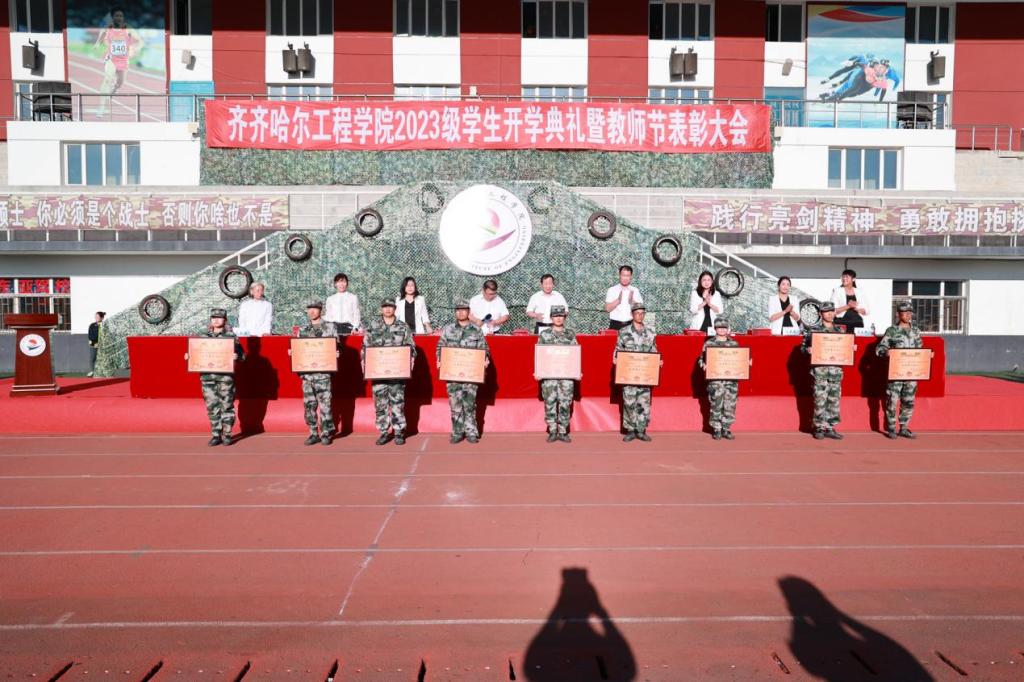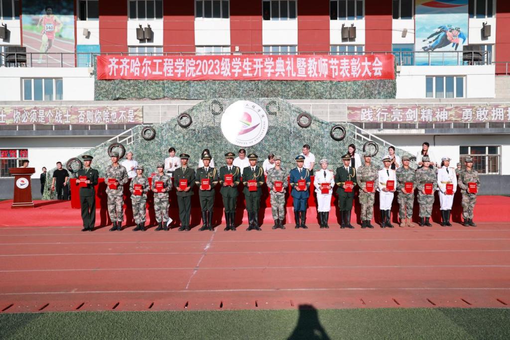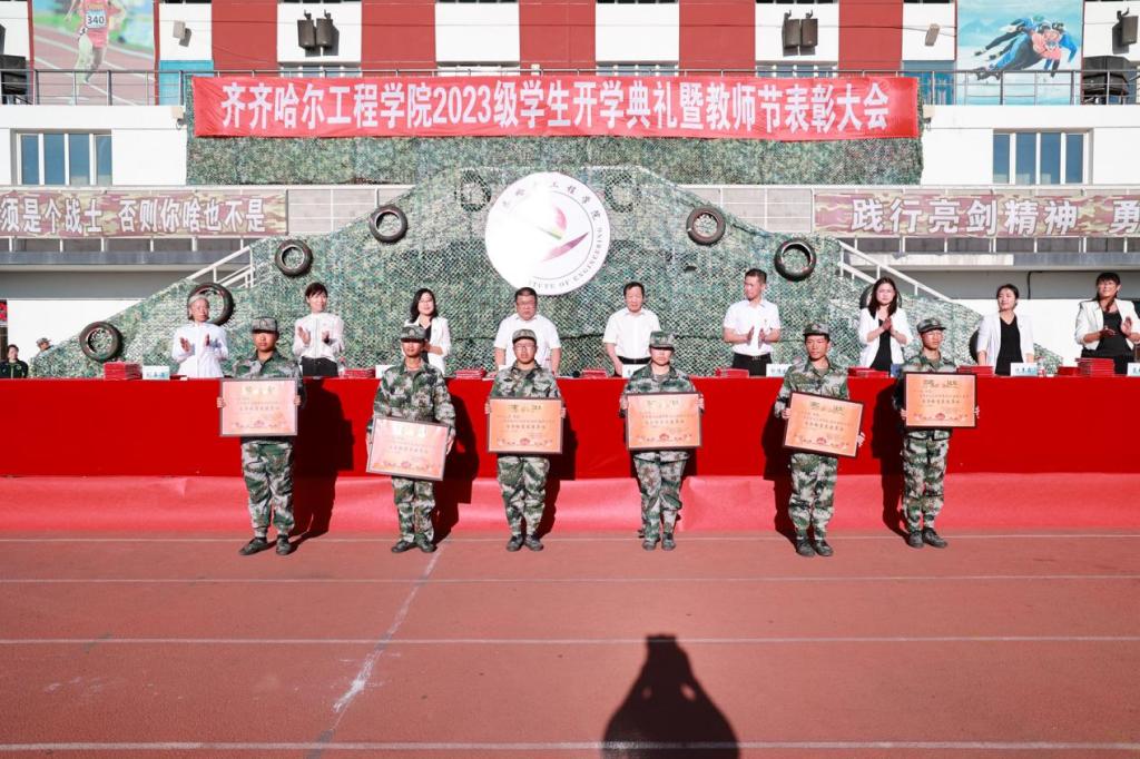 党委书记郭伟东宣读《关于表彰2023级学生军训先进集体及先进个人的决定》,对在本次军训工作中取得突出成绩的先进连队和先进个人予以表彰。机电工程系一营一连等10个连队被评为2023级学生军训优秀参训连队;建筑工程系三营十六连等6个集体被评为2023级学生军训内务检查先进集体;774名学生分获各项个人荣誉。
