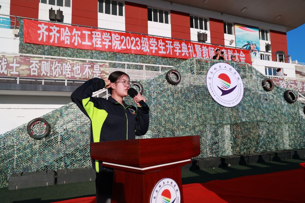 信息工程系计科232班蔡依琳同学代表新生发言,表示通过此次军训活动,身心得到了锻炼,增进了同学之间的感情,要把爱国热血融入学习、生活之中,铸就无悔青春,向时代交出一份合格的答卷。