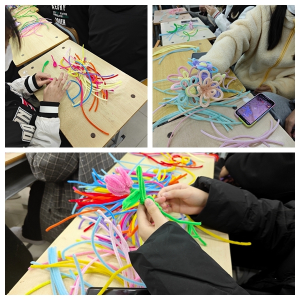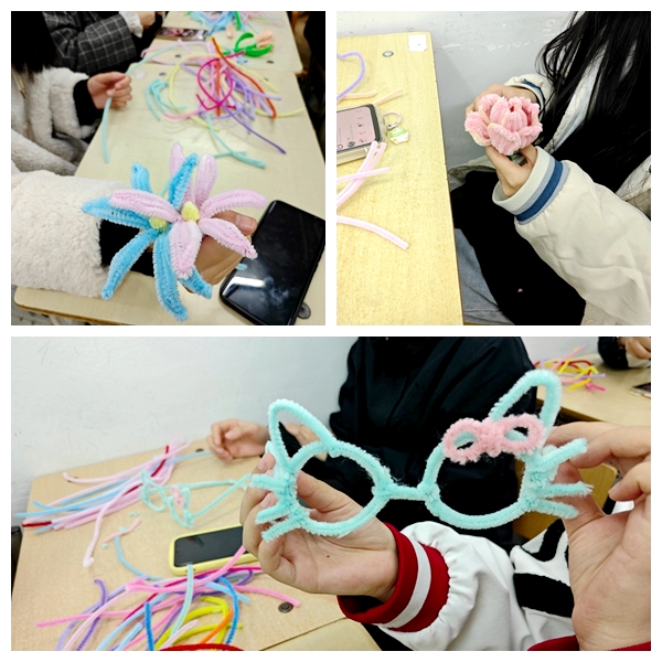 同学们互相交流、学习,现场气氛温馨融洽。很快就制作出各种令人惊喜的作品,有的编成可爱的小猫眼镜,有的编织成美丽的花朵,还有的做成了小风铃。这些作品不仅展示了学生们的创意和才华,也让大家体会到了扭扭棒的无限可能。