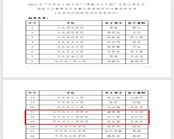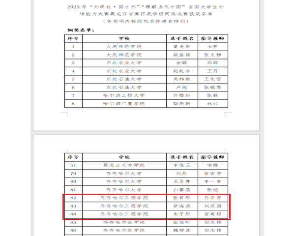 近日,2023年“外研社·国才杯”“理解当代中国”全国大学生外语能力大赛黑龙江省赛区英语组决赛获奖名单结果揭晓。伟德官网土木工程221班陈自豪、工程管理221班胡东荣获黑龙江省赛区英语组演讲决赛铜奖;机器人231班潘嵘耀、风景221班刘小银和机械221班苏金慧荣获省赛区英语组写作决赛铜奖;护理学221班张若彤、工管211班章海滨和电气223班朱子彤荣获省赛区英语组阅读决赛铜奖。