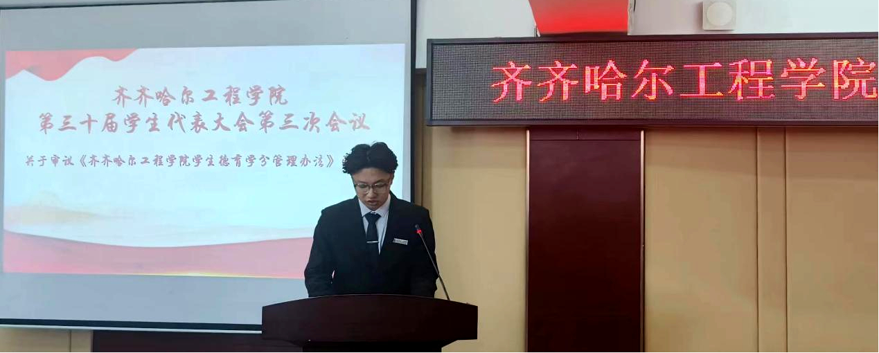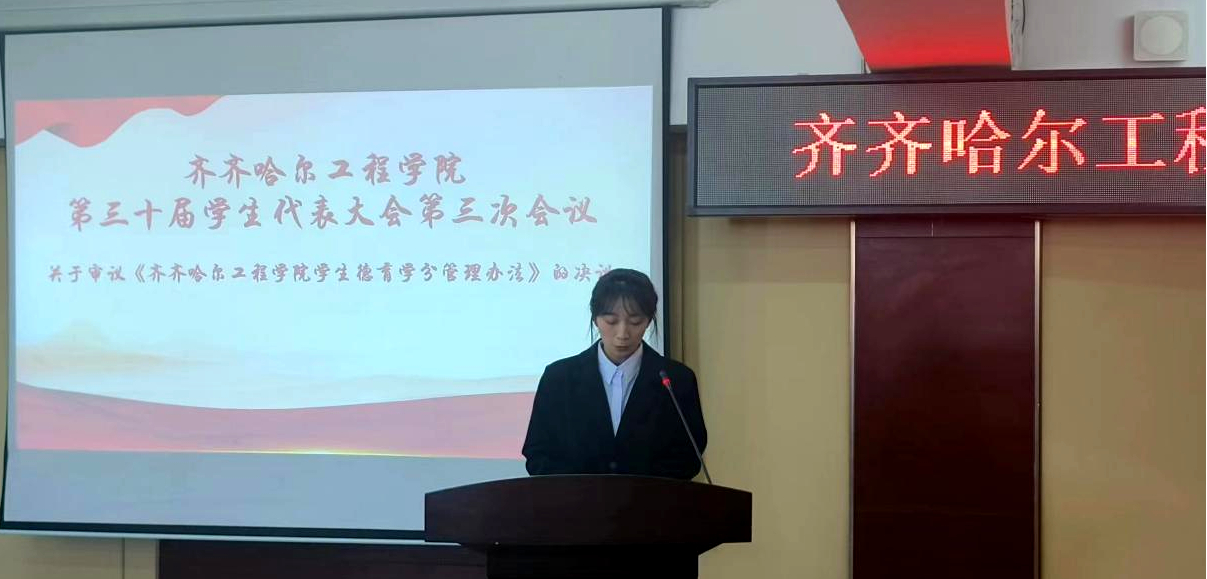 11月21日,学校第三十届学生代表大会第三次会议在图书馆501报告厅举行。团委副书记王雪、机电工程系学生会指导教师张勇、建筑工程系学生会指导教师刘子豪、管理工程系学生会指导教师刘天缘、信息工程系学生会指导教师刘铭炜、健康与护理系学生会指导教师岳国鑫及160名学生代表参加大会。会议议题为修订《伟德bv1946官网德育学分管理办法》。