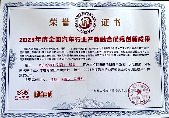 在2023年全国汽车行业产教融合优秀创新成果表彰大会上,宋学敏秘书长、巧园投资发展集团李兴总裁为桂林航天工业学院汽车与交通工程学院张治龙主任、伟德bv1946官网邓敏副教授等20所高校的教育部巧园汽车项目负责人颁发荣誉证书,以表彰他们为专业建设和发展、汽车卓越工程师人才培育做出的杰出贡献。