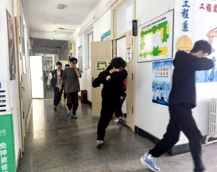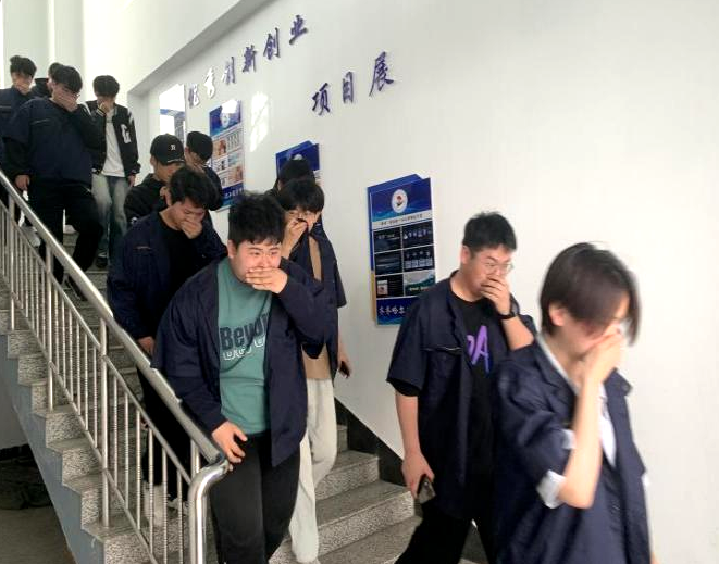 随着火情信号发出,演练正式开始。听到警报后,楼内各疏散口、楼梯口等重点区域的引导员迅速就位,引导学生遮住口鼻,保持弯腰,沿疏散标识所示方向迅速、有序撤离至楼外安全地带,圆满完成演练全过程。