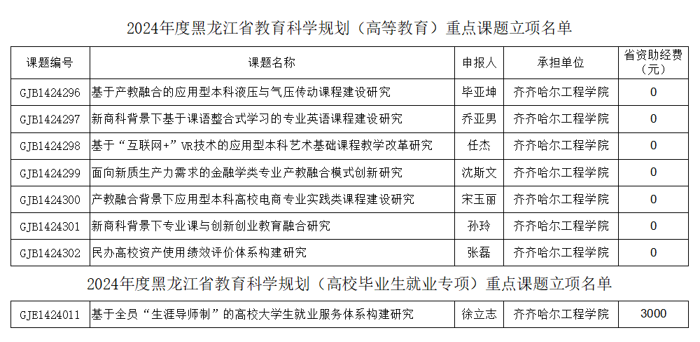日前,黑龙江省教育科学规划领导小组下发《关于确定2024年度省教育科学规划课题立项名单的通知》(黑教科规〔2024〕1号)公布课题立项结果,伟德官网组织申报的8项省级重点课题获批立项(包括高等教育类7项,毕业生就业专项1项)。其中,毕业生就业专项重点课题全省仅批准30项,只有10项获得省经费支持,伟德官网徐立志老师的课题位列其中并获得3000元资助。