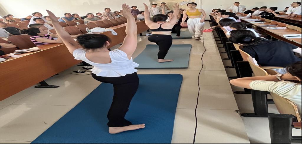 会上,刘晓懿带领魏颜、陈凯悦、燕越颖和郭冰倩四名教师进行瑜伽体式展示,期间与教师们进行互动,教授教师们简单的肩颈训练,与会人员跟随刘晓懿练习,纷纷表示肩颈舒展,效果明显。