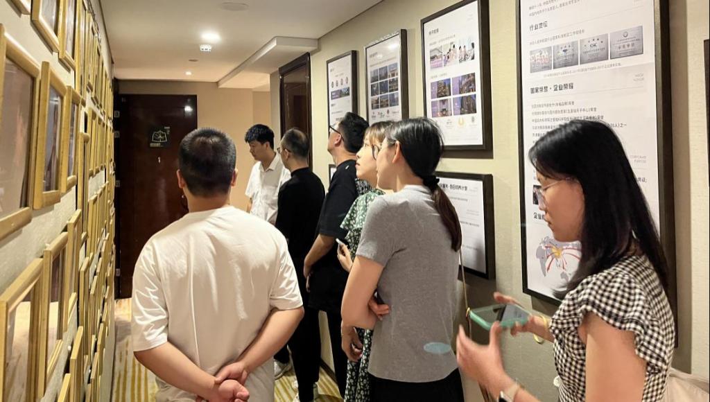 在巍阁(北京)品牌管理有限公司,招商部经理胡皓和李栋宇带领学校教师参观了巍阁的文化走廊和产品展区,详细了解企业特色和环境设施。