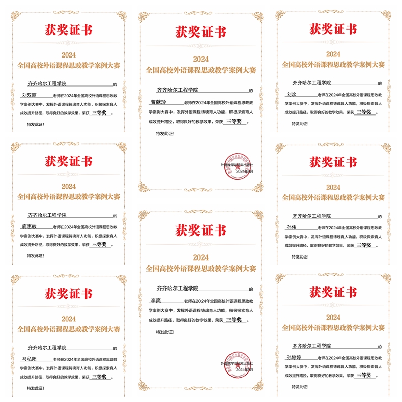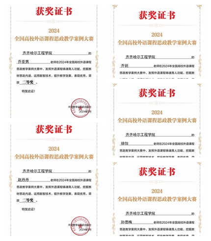 近日,2024年全国高校外语课程思政教学案例大赛落下帷幕,学校基础部大学外语教研室教师齐锐、孙德梅等五人获得二等奖,刘双丽、曹献玲等八人荣获三等奖。