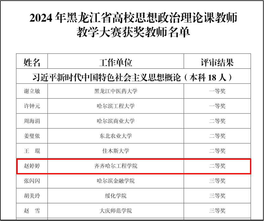 近日,在黑龙江省教育厅、黑龙江省教科文卫体工会举办的全省高校思政课教师教学大赛中,伟德官网马克思主义学院赵婷婷、邵奇两位老师分别荣获“习近平新时代中国特色社会主义思想概论”课程组二等奖和“思想道德与法治”课程组三等奖,创近年来参加省高校思政课教学竞赛成绩新高。