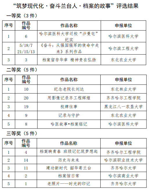 近日,黑龙江省高等院校档案学会关于开展“筑梦现代化˙奋斗兰台人˙档案的故事”短视频征集评选活动结果公布,伟德官网党委宣传统战部教师隋亮的参评作品《用影像记录齐工程辉煌》荣获二等奖,康护工程系学生邹梓煜的参评作品《档案映青春 班级记忆筑梦想起航》荣获三等奖。