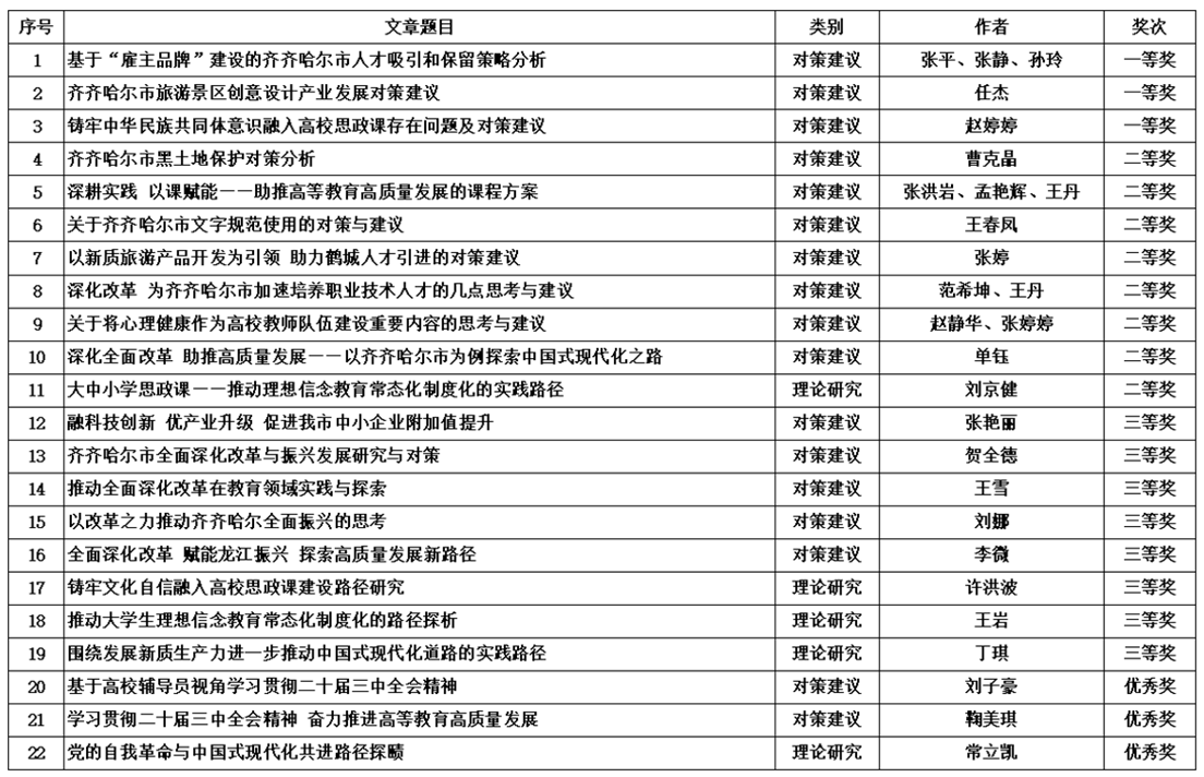 近日,市委宣传部、市社科联下发《关于学习宣传贯彻党的二十届三中全会精神主题征文评选结果的通知》(齐社联通〔2025〕1号),伟德官网推荐申报的22篇征文作品均获奖,其中一等奖3篇,二等奖8篇,三等奖8篇,优秀奖3篇,超过全市获奖征文总数的1/6。