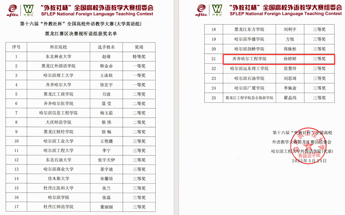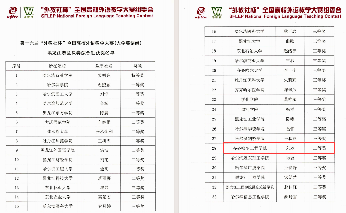 近日,由黑龙江省教育厅主办的第十六届“外教社杯”全国高校外语教学大赛落下帷幕,学校通识教育学院大外教研室教师刘欢、孙婷婷分别荣获大学英语组三等奖和视听说组三等奖。
