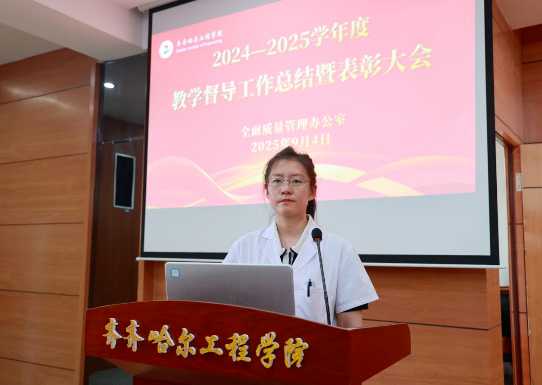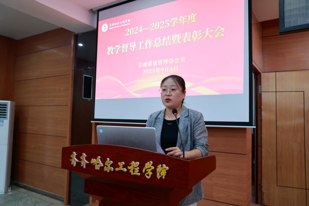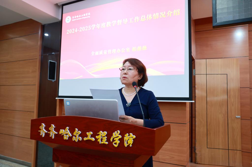 校级教学督导员柏薇薇老师对2024-2025学年度教学督导工作进行了总结。她表示,在本年度的教师课堂教学中,教师在教学基本功、授课方式、课堂学习氛围、课程思政融合以及实验教学质量等方面均取得了显著进步。同时,她对督导过程中发现的问题作了全面而深入的梳理,对当前教学中仍存在的不足进行了说明,对新学年的工作设想进行了阐述。