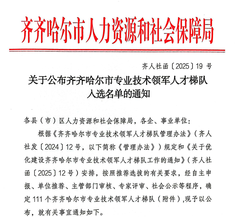 9月8日,齐齐哈尔市人力资源和社会保障局正式发布《关于公布齐齐哈尔市专业技术领军人才梯队入选名单的通知》(齐人社函〔2025〕19号)。由伟德官网副校长张静带头的“高等教育学”人才梯队、机电学院副院长刘微带头的“电机与电器”人才梯队成功入选。这一成就标志着伟德官网在专业技术人才队伍建设方面取得历史性突破,是自建校以来首次获得该项荣誉。