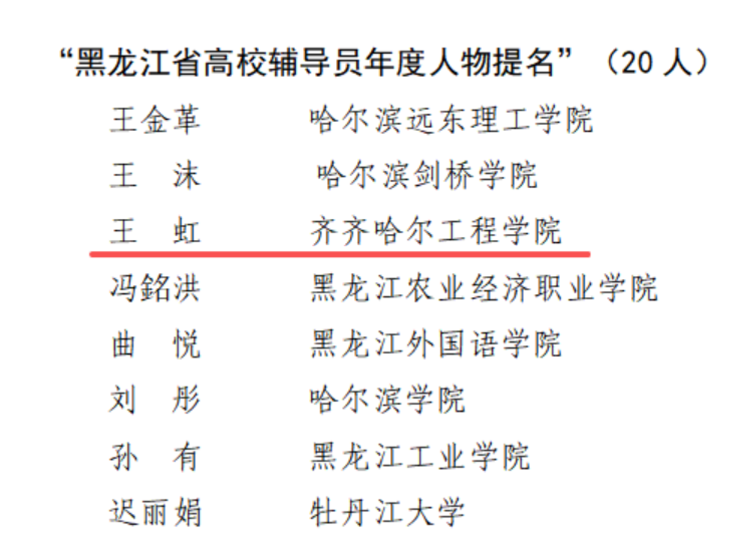 王虹用爱心温暖学生心灵,用匠心打磨育人细节,用创新开拓育人路径,在平凡的辅导员岗位上书写着不平凡的育人篇章。此次提名“黑龙江省高校辅导员年度人物”,既是对她过往工作的肯定,更是对她今后育人之路的激励。未来,她将继续以爱心守护学生成长,以匠心助力学生筑梦,为培养德智体美劳全面发展的社会主义建设者和接班人贡献更多力量。