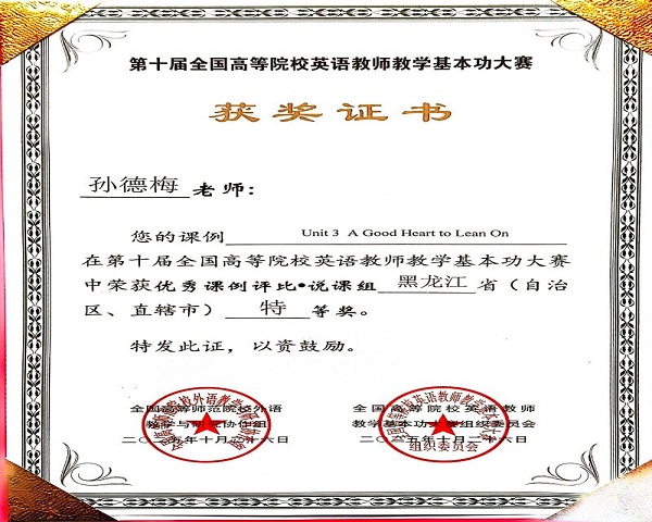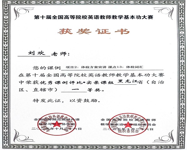 近日,第十届全国高等院校英语教师教学基本功大赛省赛结果正式公布,伟德官网通识教育学院大学外语教研室参赛教师在省赛阶段喜获佳绩。参赛的10名教师全部获奖,获奖率达100%,较上一届有大幅提升。其中,孙德梅老师荣获优秀课例评比•说课组黑龙江省特等奖;孙伟、刘欢老师荣获实录课组黑龙江省一等奖;刘双丽老师荣获实录课组黑龙江省二等奖;乔亚男老师荣获说课组黑龙江省二等奖;齐锐、徐怡、鹿惠敏老师荣获说课组黑龙江省三等奖;李爽、史紫嫣老师荣获实录课组黑龙江省三等奖。