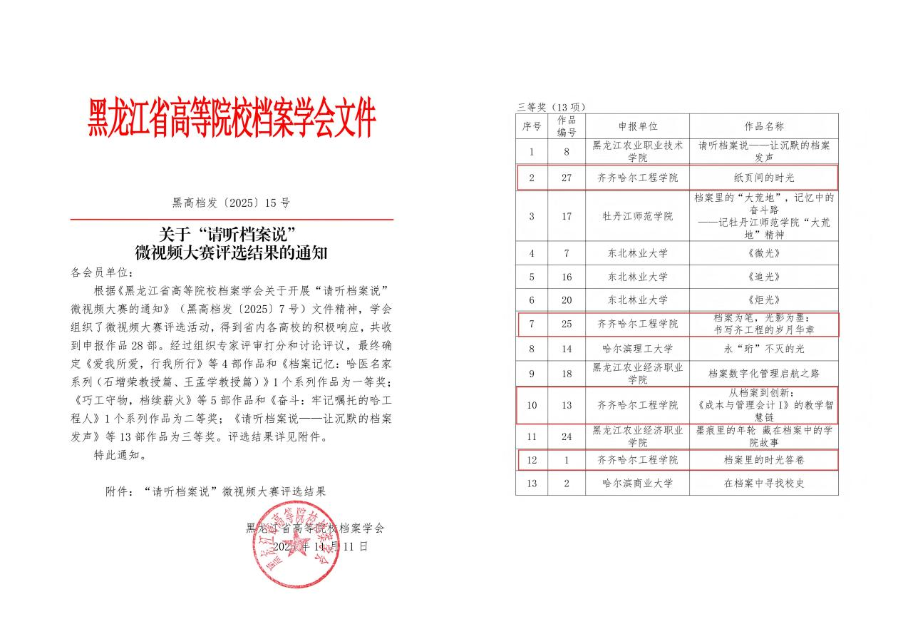 大赛中,学校选送的多部作品在全省众多申报作品中脱颖而出。《纸页间的时光》通过班级档案定格青春细节,见证学生成长,传递温暖共鸣;《档案为笔,光影为墨:书写齐工程的岁月华章》聚焦影像档案人的坚守与创新,彰显校园记忆的独特价值;《从档案到创新:〈成本与管理会计I〉的教学智慧链》全面记录课程档案,助力教学质量和育人效果双提升;《档案里的时光答卷》以财务档案为载体诉说校史,记录学校从创业到跨越的发展历程。这四部作品题材丰富多样,形式新颖独特,既深入挖掘档案背后的文化内涵,又巧妙融入学校的办学特色与精神传承,赢得了评审专家的一致好评。
