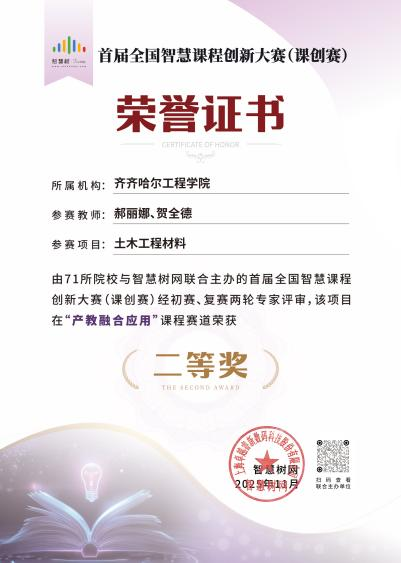 11月21日,卓越智慧树发布了首届“智慧树杯”全国智慧课程创新大赛(课创赛)获奖名单,学校《土木工程材料》课程获得二等奖,此次获奖是学校智慧课程建设的重要成果。
